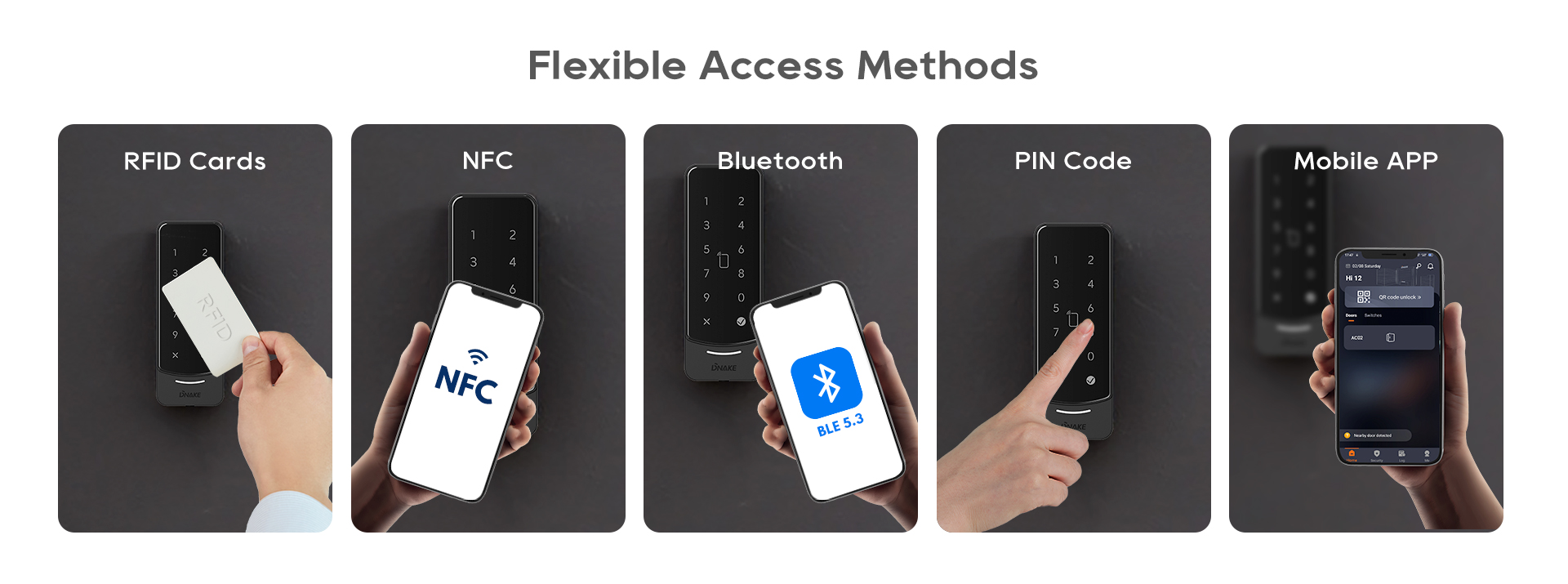 • Door entry methods: RFID cards, PIN, NFC, Bluetooth, APP