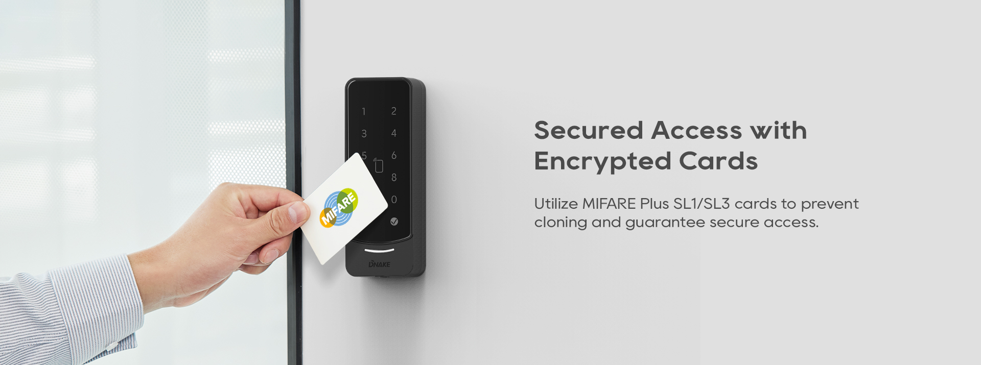 • Secured access with encrypted card (MIFARE Plus SL1/SL3 card)